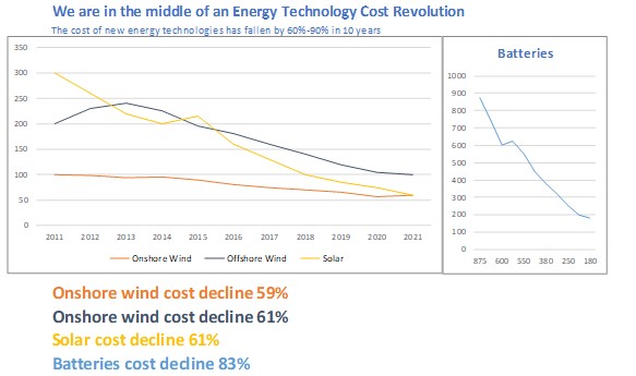 - The cost of new energy technologies has fallen by 60%–90% in 10 years