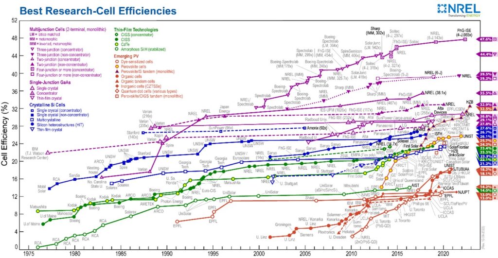 - Technology not Ideology – The energy transition is not primarily a debate about ideology or values. It is simply a profound technological shift. This shift has for example led to a dramatic increase in the efficiency of solar PV technology. Where early Si based solar cells in the 1980s struggled to exceed 5% cell efficiency, the same materials now exceed 15% efficiency and are closing rapidly on the theoretical limit of 22%. Novel technologies such as multi-junction devices can approach 45% efficiency but are presently too expensive to deploy widely.